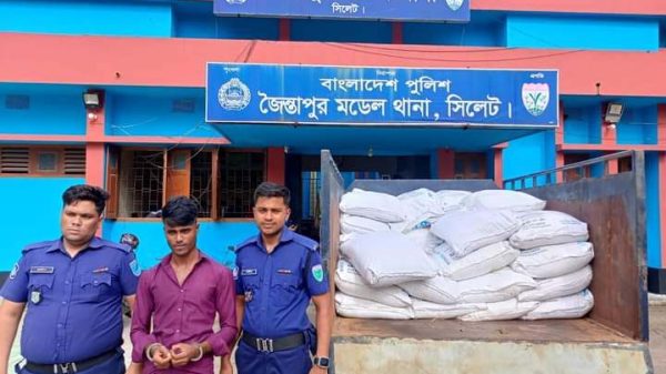 সিলেটের জৈন্তাপুর মডেল থানায় ৫০ বস্তা ভারতীয় চিনিসহ ১ চোরাকারবারি গ্রেফতার অপরাধ দমন, আসামি গ্রেফতার ও চোরাচালান রোধ সহ সার্বিক আইনশৃঙ্খলা রক্ষায় জেলা পুলিশ, সিলেট নিরলসভাবে কাজ করে যাচ্ছে। তাছাড়া মাদকের প্রসার রোধ ও মাদক পরিবহন ও ব্যবসার কাজে জড়িত অপরাধীদের চিহ্নিতকরণ এবং গ্রেফতারে জেলা পুলিশ, সিলেট গুরুত্বের সঙ্গে কাজ করে যাচ্ছে। এরই ধারাবাহিকতায় অদ্য ২ রা আগষ্ট ২০২৩ তারিখ সকালে বিশেষ অভিযান চলাকালে জৈন্তাপুর, কানাইঘাট সার্কেলের সার্কেল স্যার ওঅফিসার ইনচার্জ, জৈন্তাপুর স্যারদ্বয়ের এর দিক নির্দেশনায় সিলেটের জৈন্তাপুর মডেল থানার পুলিশ অভিযান চালিয়ে ভারতীয় ৫০বস্তা চিনির চালান আটক করেছে জৈন্তাপুর মডেল থানার পুলিশ।