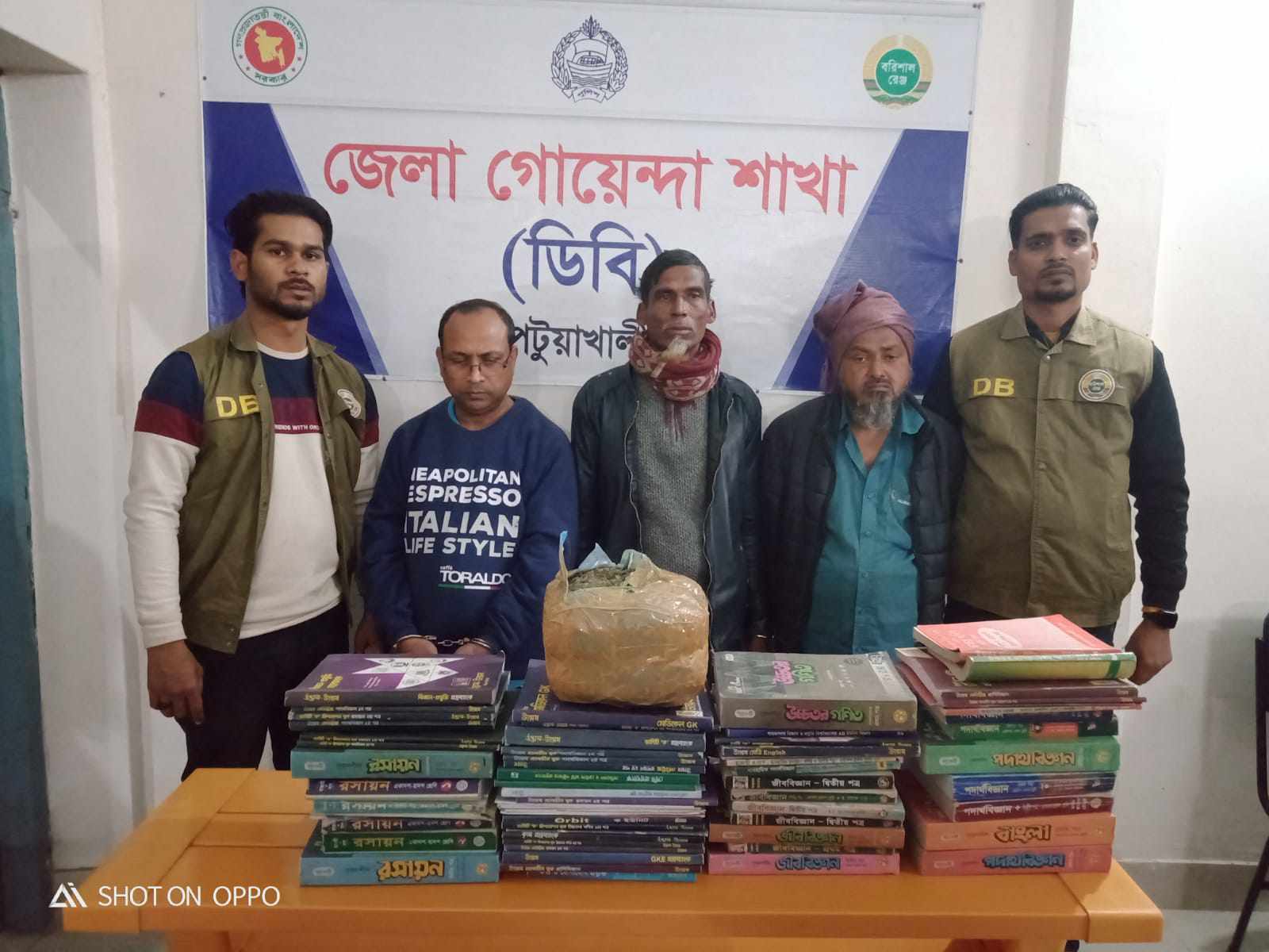 জেলা গোয়েন্দা শাখা ডিবি পুলিশ সুত্রে,-র্দীঘ দিন থেকে চট্টগ্রামের দ্রুব পাল পটুয়াখালীর জালাল ও আলম ফরাজীকে গাঁজা সরবরাহ করতেন। ঘটনার দিন গোপন সংবাদের ভিত্তিতে ডিবির এসআই সঞ্জীব কুমার সরকারের নেতৃত্বে ওৎপাতেন ডিবি পুলিশ। উল্লেখিত তথ্যের ভিত্তিতে তিন জনকে আটক করা হয়। এসময় তাদের কাছ থেকে বিভিন্ন শ্রেণীর পাঠ্যবইয়ের একটি বস্তা জব্দ করেন তারা। বস্তা খুলে দেখতে পান বইয়ের পাতার ভেতরের অংশ কেটে গাঁজা সংরক্ষনের স্থান তৈরী করে দুই কেজি গাঁজা বহন করে নিয়ে যাচ্ছেন তারা। এসময় ডিবির জিজ্ঞাসাবাদে আটককৃতরা জানান-পটুয়াখালীর বিভিন্ন স্থানে বিক্রি করার জন্য চট্টগ্রাম থেকে এ গাঁজা আনা হয়েছে।