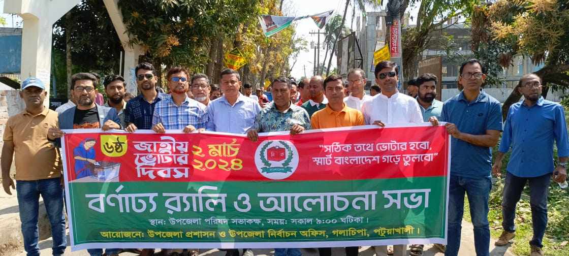 "সঠিক তথ্যে ভোটার হবো, স্মার্ট বাংলাদেশ গড়ে তুলবো” এই প্রতিপাদ্যে পটুয়াখালীর গলাচিপায় ৭ম জাতীয় ভোটার দিবস ২০২৪ পালিত হয়েছে।