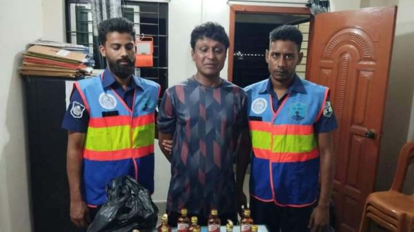 ছাতকে ভারতীয় মদ সহ আনোয়া হোসেন দুলাল (৪২) নামের এক মাদক বিক্রতাকে আটক করেছে নৌ-পুলিশ। রোববার রাতে পৌর শহরের চাউল বাজার সংলগ্ন সুরমা নদীর তীর সংল্গন এলাকা থেকে তাকে ভারতীয় মদ সহ আটক করা হয়। আনোয়া হোসেন দুলাল পৌর শহরের বাগবাড়ী মহল্লার মৃত সুরুজ মিয়ার পুত্র। গোপন সংবাদের ভিত্তিতে ছাতক নৌ-পুলিশের এসআই আতিক আনোয়ারের নেতৃত্বে সুরমা নদীর তীর সংগ্লন অভিযান চালিয়ে চাউল হাটা ঘাট থেকে ১৩ বোতল ভারতীয় অফিসার চয়েজ মদ সহ আনোয়ার হোসেন দুলালকে আটক করা হয়। সোমবার তার বিরুদ্ধে মাদকদ্রব্য নিয়ন্ত্রণ আইনে ছাতক থানায় একটি মামলা (০৮) দায়ের করা হয়েছে। নৌ-পুলিশ জানায় সুরমা নদী ও তার আশপাশ এলাকায় রাত্রিকালীন নৌ টহল ডিউটিতে নিয়োজিত থাকাকালে চাউল বাজার সংলগ্ন সুরমা নদীর পাকা ঘাট হতে তাকে আটক করা হয়। সে দীর্ঘদিন ধরে পৌর এলাকায় সুরমা নদীতে নৌকা যোগে এবং অনেক সময় সুরমা নদীর তীরে মাছ বাজার ঘাট, চাউল বাজার ঘাট চৌধুরী বাজার ঘাট সহ আশপাশ এলাকায় মাদকদ্রব্য বিক্রি করে আসছিল। ছাতক নৌ-পুলিশের ইনচার্জ, পুলিশ পরিদর্শক আনোয়ার হোসেন আটকের বিষয়টি নিশ্চিত করে জানান, এলাকার নদীপথে মাদকদ্রব্য সহ অবৈধ মালামাল সরবরাহ প্রতিরোধে ছাতক নৌ পুলিশ সর্বদা সজাগ রয়েছে । অভিযান অব্যাহত থাকবে।