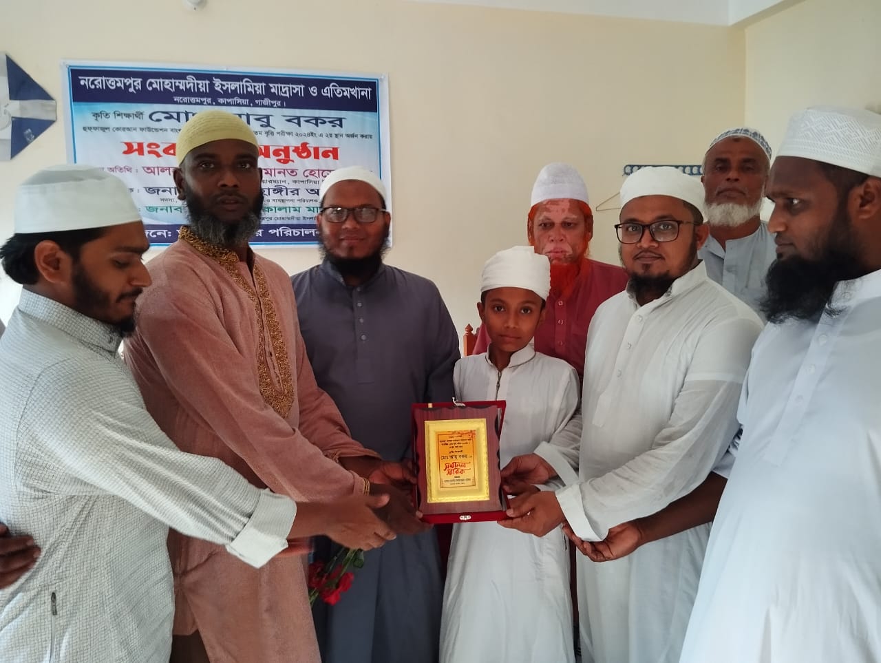 আজ (১লা জুন) রোজ শনিবার গাজীপুর জেলাধীন কাপাসিয়া উপজেলার বারিষাব ইউনিয়নের নরোত্তমপুর মোহাম্মাদীয়া ইসলামিয়া মাদ্রাসা ও এতিমখানা প্রাঙ্গনে উক্ত মাদ্রাসার আয়োজনে এ সংবর্ধনা অনুষ্ঠানের আয়োজন করা হয়। কাপাসিয়া উপজেলা পরিষদের পুনঃনির্বাচিত চেয়ারম্যান আলহাজ্ব এ্যাড. আমানত হোসেন খান প্রধান অতিথি হিসেবে উপস্থিত থেকে অত্র মাদ্রাসার কৃতি শিক্ষার্থী মোঃ আবু বকরের হাতে সম্মান সূচক ক্রেস্ট তুলে দেন।