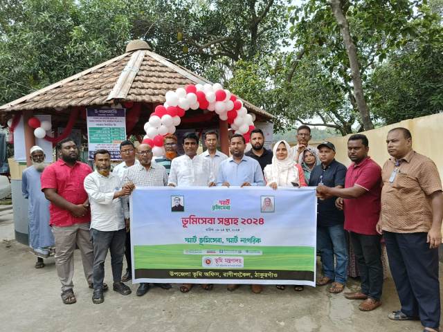 "স্মার্ট ভূমি সেবা, স্মার্ট নাগরিক" এই প্রতিপাদ্যকে সামনে রেখে সারাদেশের ন্যায় ঠাকুরগাঁওয়ের রাণীশংকৈলে ভূমি সেবা সপ্তাহের উদ্বোধন করা হয়েছে। শনিবার (৮ জুন) সকালে উপজেলা ভূমি অফিসে ভূমি সেবা সপ্তাহ-২০২৪ এর উদ্ধোধন করেন নব নির্বাচিত উপজেলা পরিষদ চেয়ারম্যান আহম্মেদ হোসেন বিপ্লব ও উপজেলা নির্বাহী কর্মকর্তা মো: রকিবুল হাসান । এ সময় আরো উপস্থিত ছিলেন সহকারী কমিশনার ভূমি আর্নিকা আক্তারসহ ভূমি অফিসের কর্মকর্তা-কর্মচারীরবৃন্দ। এ ব্যাপারে উপজেলা নির্বাহী অফিসার বলেন, সারাদেশের ন্যায় রাণীশংকৈলে সাত দিনব্যাপী ভূমি সেবা সপ্তাহ শুরু হয়েছে। পুরো সপ্তাহ জুড়ে স্থাপিত বিভিন্ন স্টলের মাধ্যমে জনগণকে ভূমি সংক্রান্ত নানান বিষয়ে পরামর্শ এবং সেবা প্রদান করা হবে।