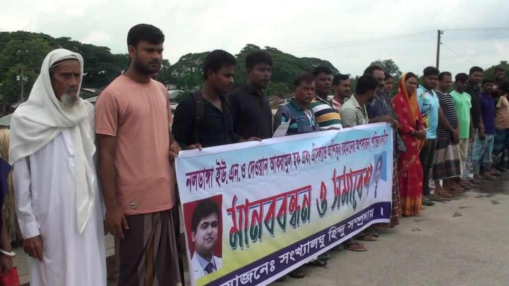 হিন্দু সম্প্রদায়ের উপর অন্যায় অবিচারের অভিযোগ এনে নাটোরের নলডাঙ্গা উপজেলা নির্বাহী কর্মকর্তা দেওয়ান আকরামুল হক এবং সহকারী কমিশনার (ভুমি) আশিকুর রহমানের অপসারণ ও শাস্তির দাবিতে মানববন্ধন ও সমাবেশ করেছে স্থানীয় হিন্দু সম্প্রদায়ের মানুষজন। আজ রবিবার বেলা ১১ টার দিকে উপজেলার নলডাঙ্গা ব্রিজের উপর এই কর্মসুচি পালন করা হয়। মানববন্ধনে বক্তব্য রাখেন, বুদ্ধদেব দাস,বিমল কুমার,শুখি রানী,বিনয় দাস সহ অন্যান্যরা। মানববন্ধনে বক্তারা বলেন, তারা দীর্ঘদিন যাবত লীজকৃত সম্পত্তিতে ভোগ দখলরত করে আসছেন। সেই সম্পত্তি নিয়ে উচ্চ আদালতে মামলা চলমান রয়েছে। উচ্চ আদালতে চলমান সিভিল রিভিশন এ স্টে-অর্ডার