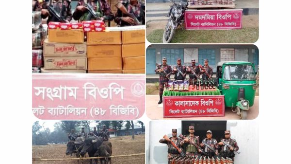 সিলেটে বিজিরিব অভিযান চালিয়ে ভারতীয় চোরাচালানের মালামাল আটক করে যাচ্ছে সিলেট ব্যাটালিয়ন ৪৮ বিজিবি।