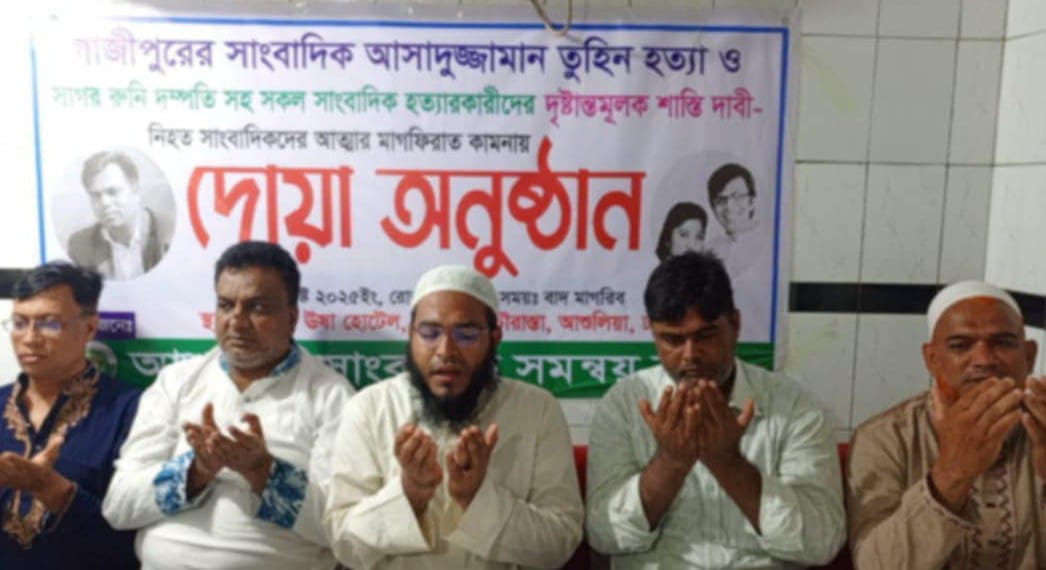 ঢাকার আশুলিয়ায় জামগড়া চৌরাস্তা আশুলিয়া সাংবাদিক সমন্বয় ক্লাবের আয়োজনে গাজীপুরের সাংবাদিক আসাদুজ্জামান তুহিন ও সাগর রুমি সহ ২৪শে জুলাই আন্দোলনের যে সকল সাংবাদিক হত্যার শিকার হয়েছেন এসব ঘটনার তীব্র নিন্দা ও প্রতিবাদ জানিয়ে এবং সাংবাদিক হত্যাকারীদের দৃষ্টান্তমূলক শাস্তি দাবি করে নিহত সাংবাদিকদের আত্মার মাগফিরাত কামনায় দোয়া অনুষ্ঠিত হয়। মঙ্গলবার (১২ আগষ্ট ২০২৫ইং) রাত ৮টায় জামগড়া চৌরাস্তা ক্যাফে ঊষা রেস্টুরেন্ট।