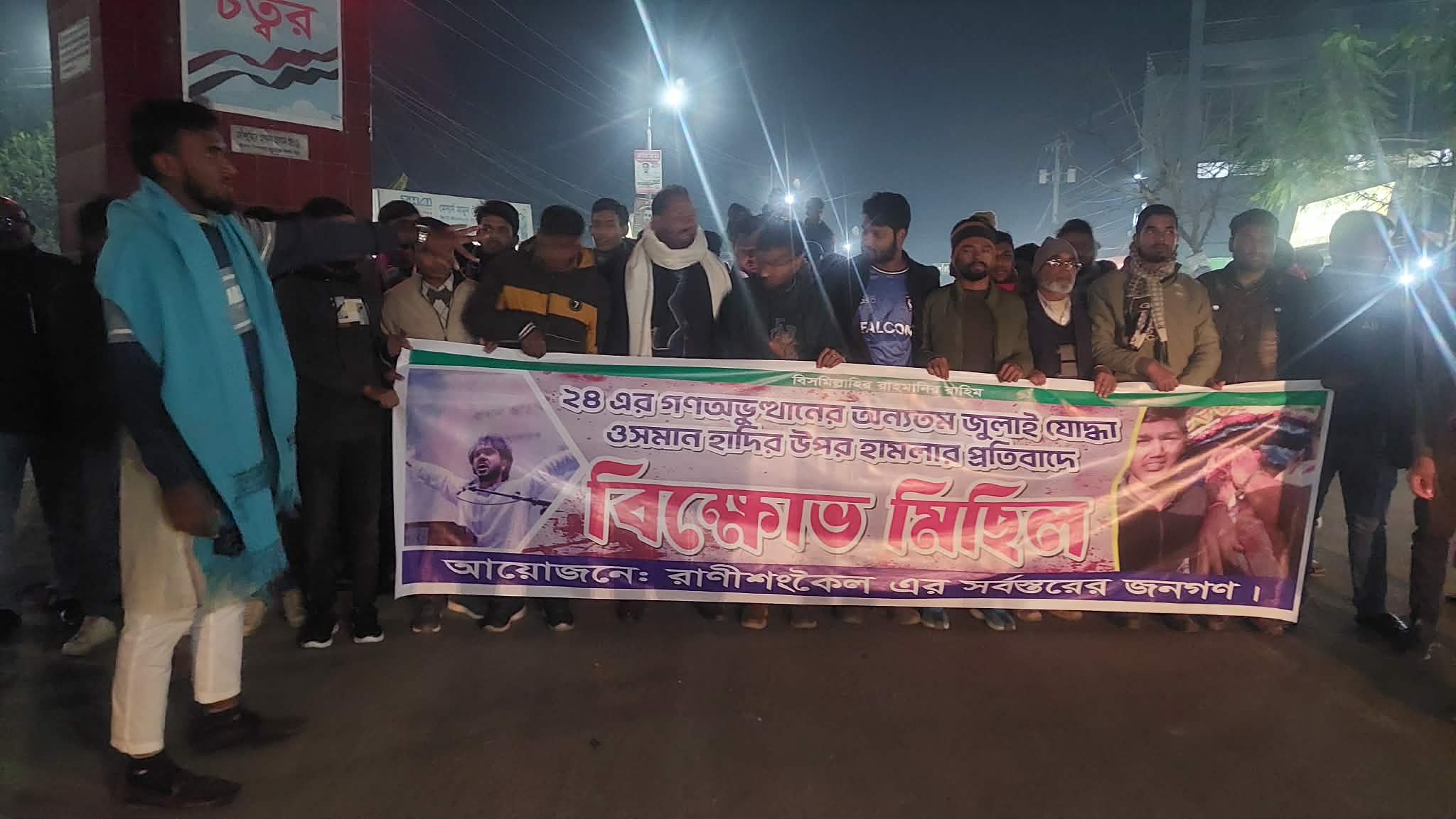 সারাদেশে আলোচিত ২৪ জুলাইয়ের গণঅভ্যুত্থান আন্দোলনের অন্যতম যুবনেতা ওসমান হাদির উপর সন্ত্রাসী হামলার ঘটনাকে কেন্দ্র করে রাণীশংকৈলে বিক্ষোভ মিছিল অনুষ্ঠিত হয়েছে। শুক্রবার রাত সাড়ে ৮টায় সর্বস্তরের জনগণের ব্যানারে এ মিছিল বের হয়। মিছিলটি পৌরশহরের শিবদিঘি যাত্রী ছাউনি মোড় থেকে শুরু হয়ে শহরের প্রধান প্রধান সড়ক প্রদক্ষিণ করে বন্দর চৌরাস্তা মোড়ে গিয়ে শেষ হয়। এতে উপস্থিত ছিলেন গণঅধিকার পরিষদের কেন্দ্রীয় নেতা মামুনুর রশীদ মামুন, ছাত্র প্রতিনিধি তারেক মাহমুদ,ছাত্রশিবির নেতা সাব্বির হোসেন,জুলাই আন্দোলনের ছাত্র সমন্বয়ক মো. হাবিব, জুলাই যোদ্ধা জসিমসহ স্থানীয় বিভিন্ন রাজনৈতিক,সামাজিক সংগঠনের নেতাকর্মী ও সাধারণ মানুষ।