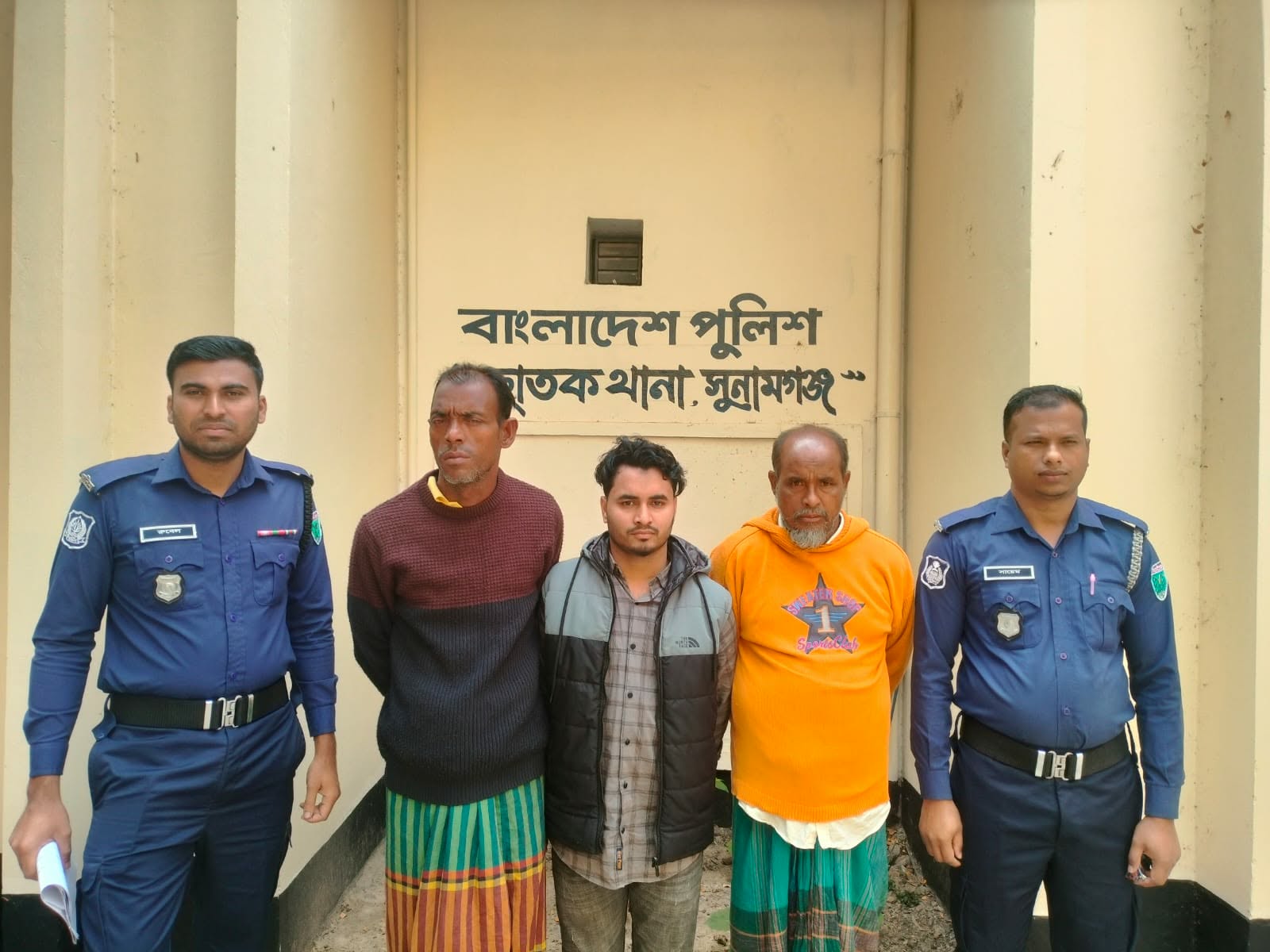 গ্রেফতার ফিরোজ মিয়া (৪৮), ইউনুস মিয়া (৩৮) ইসলামপুর ইউনিয়নের রহমতপুর গ্রামের মনির মিয়ার পুত্র ও ইয়াছিন আহমদ (২০) ফিরোজ মিয়ার পুত্র।