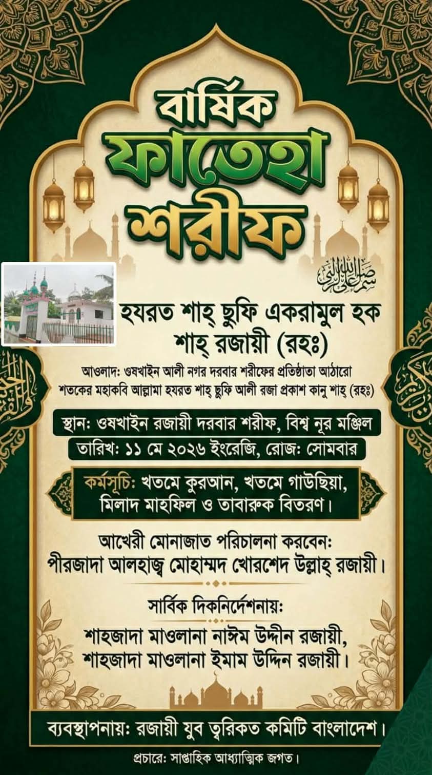 বাংলাদেশের ঐতিহ্যবাহী আধ্যাত্মিক কেন্দ্র ওষখাইন রজায়ী শরীফে আগামী ১১ মে ২০২৬, সোমবার পবিত্র বার্ষিক ফাতেহা শরীফ অনুষ্ঠিত হতে যাচ্ছে। আউলাদে সিদ্দিকে আকবর পাচঁ ত্বরিকত পীর ৩৬বছর বনবাস আধ্যাত্মিক সাধক ও ১৮শতকের মহাকবি হযরতে শাহ্ সূফী সৈয়দ আল্লামা আলী রজা প্রকাশ কানু শাহ্ (রহঃ)’র ছোট মিয়ার আউলাদ হযরত শাহ সূফী সৈয়দ একরামুল হক শাহ্ রজায়ী (রহঃ)-এর স্মরণে প্রতি বছরের ন্যায় এবারও ধর্মীয় ভাবগাম্ভীর্যের মধ্য দিয়ে এই আয়োজন সম্পন্ন হবে।(ইনশাল্লাহ)