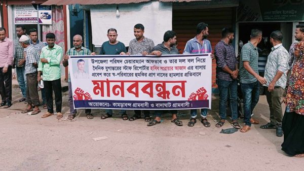 তাহিরপুরে সাংবাদিক কে প্রাণনাশের হুমকির প্রতিবাদে মানববন্ধন করেছে এলাকাবাসী-গাজীপুর সংবাদ