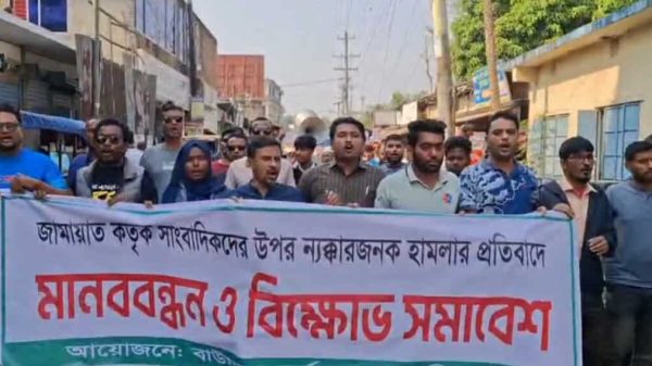 প্রথম আলো ও দ্য ডেইলি স্টারে হামলার প্রতিবাদে তাহিরপুরে সাংবাদিকদের মানববন্ধন-গাজীপুর সংবাদ