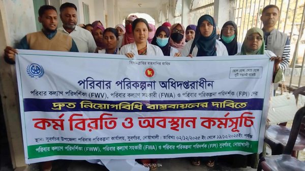 সুবর্ণচরে নিয়োগবিধি বাস্তবায়নের দাবিতে পরিবার পরিকল্পনা কর্মীদের অবস্থান কর্মসূচি-গাজীপুর সংবাদ